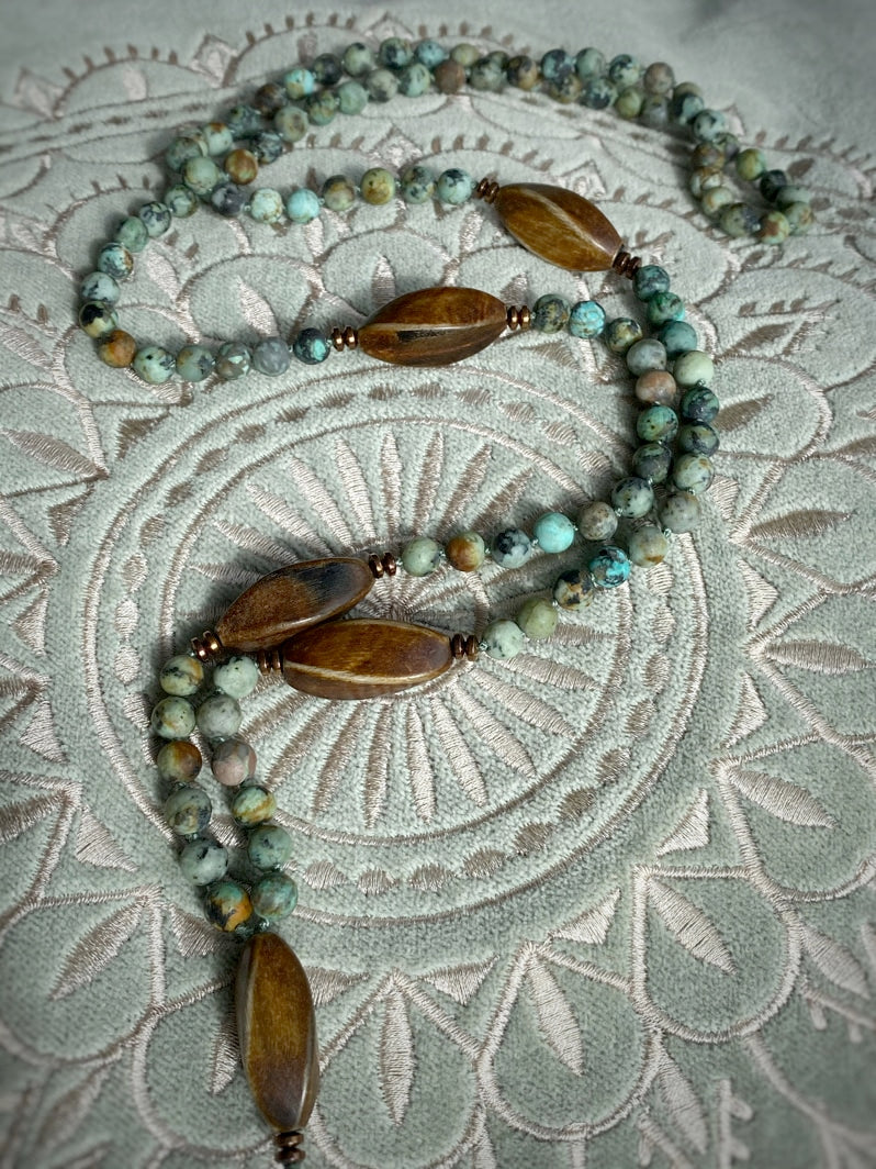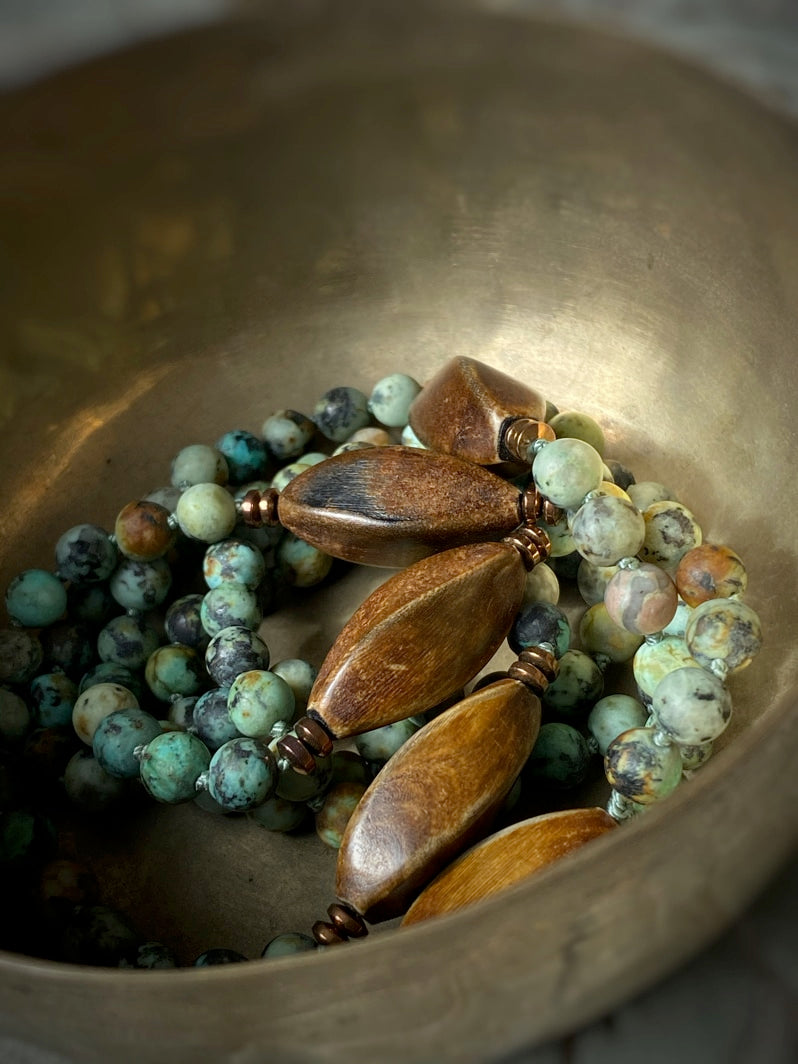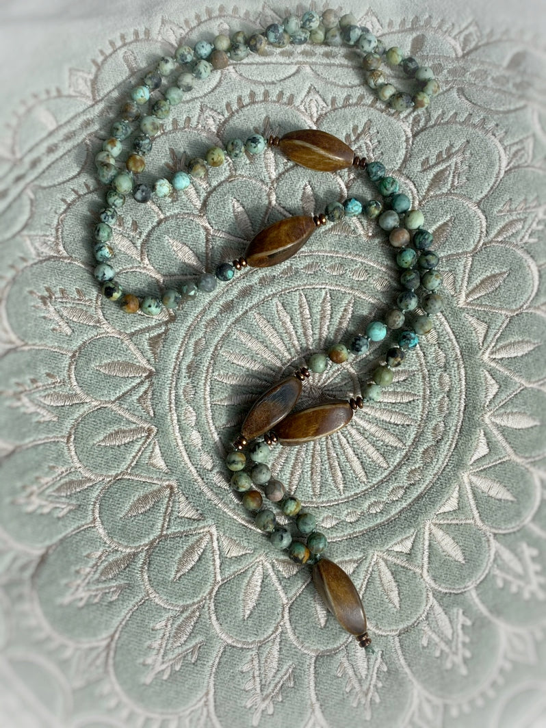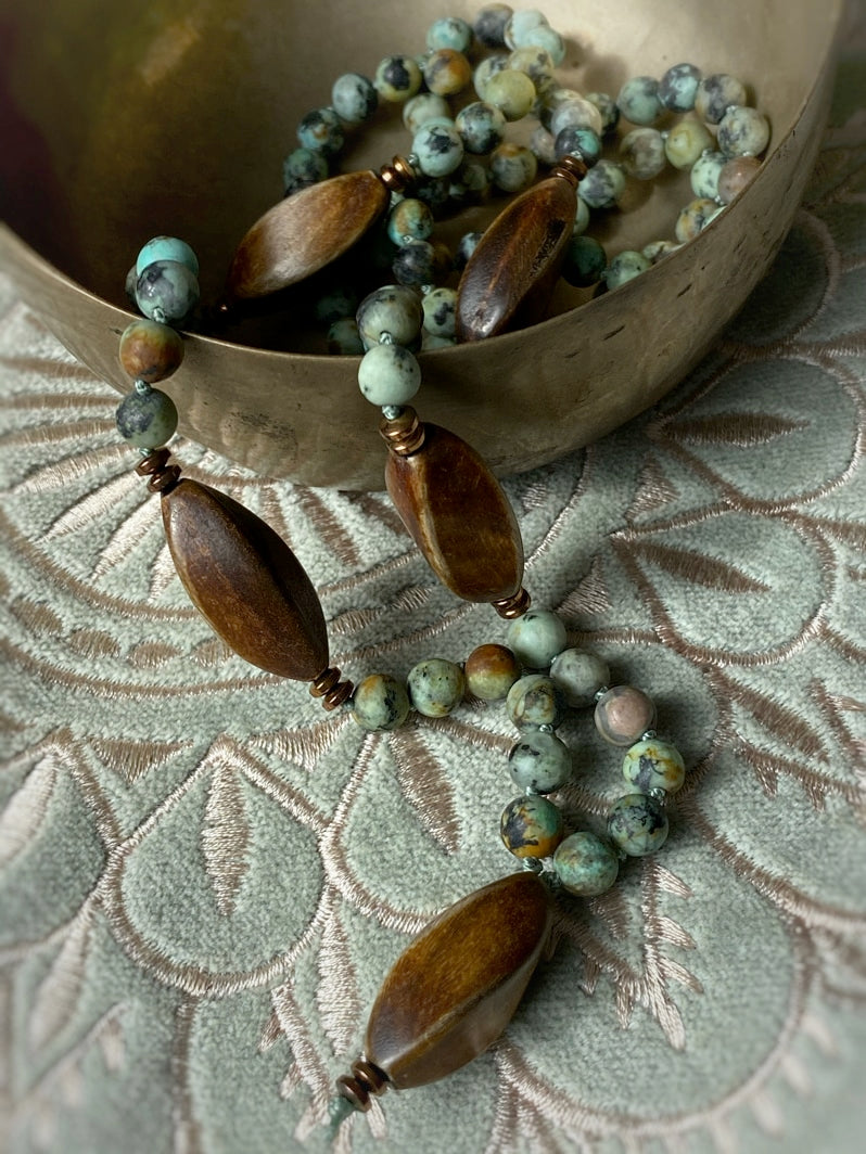 Afrikanischer Türkis ist eine Mischung aus Chrysokoll und grünem Jaspis. Beide Steine wirken auf das Herzchakra und können dabei helfen, stressige Situationen besser zu meistern und innere Harmonie zu bewahren. Er gilt als Schutzstein und soll Standhaftigkeit in schwierigen Situationen geben.