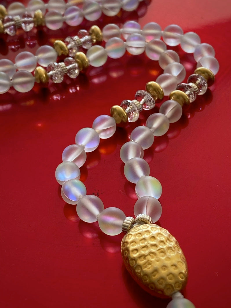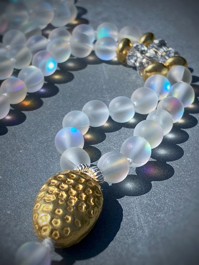 Abschluss: Vergoldeter handgehämmerter Tropfen mit Regenbogen-Mondstein-Perlen 6mm
