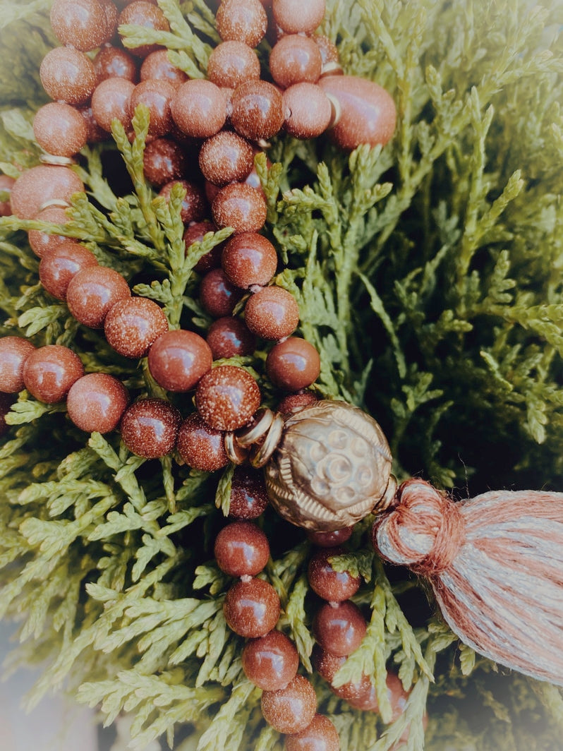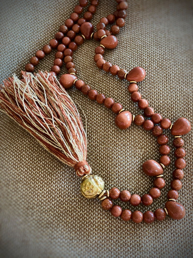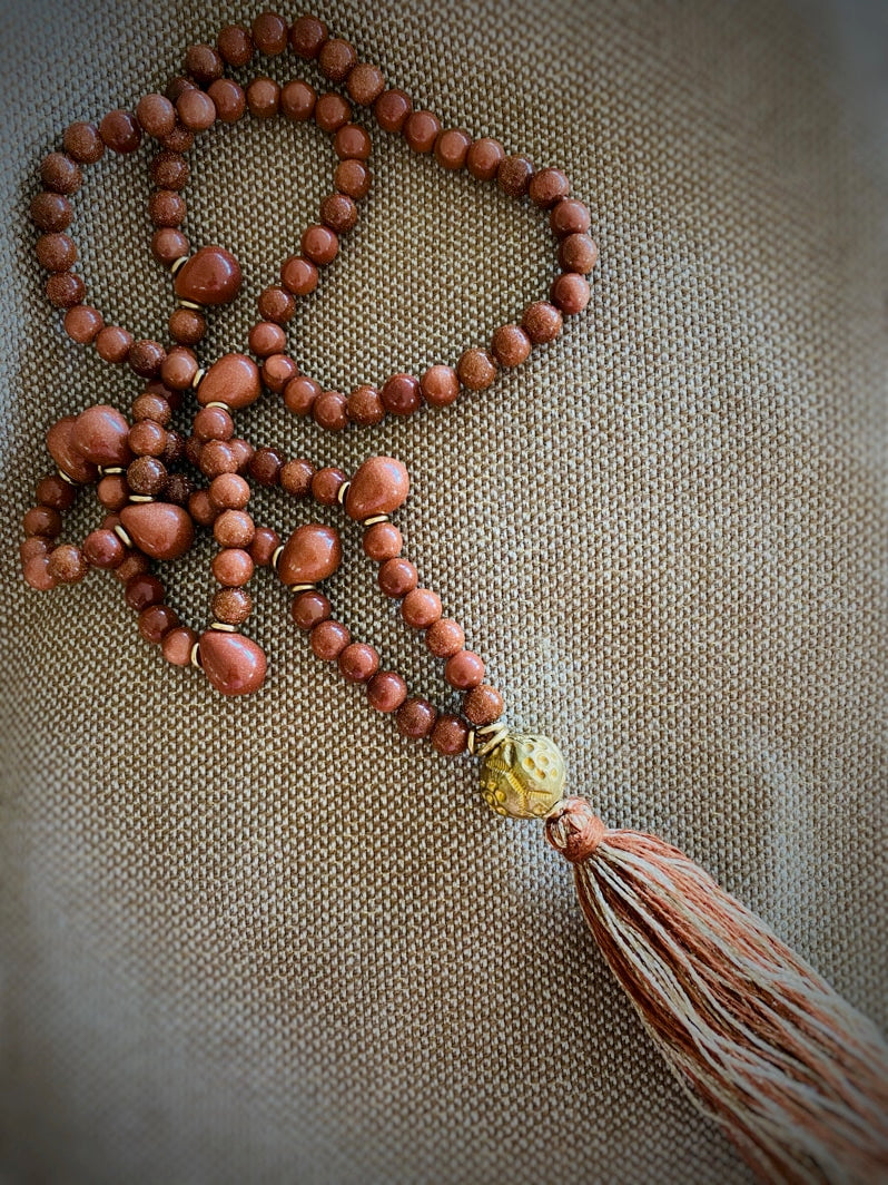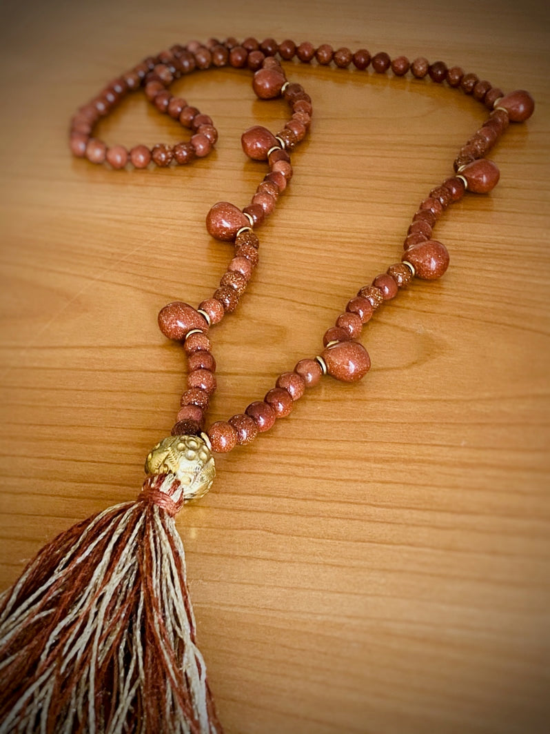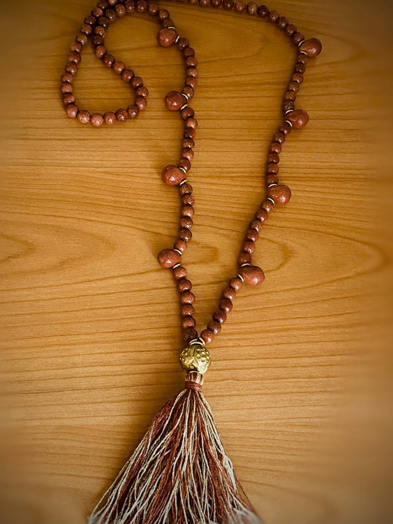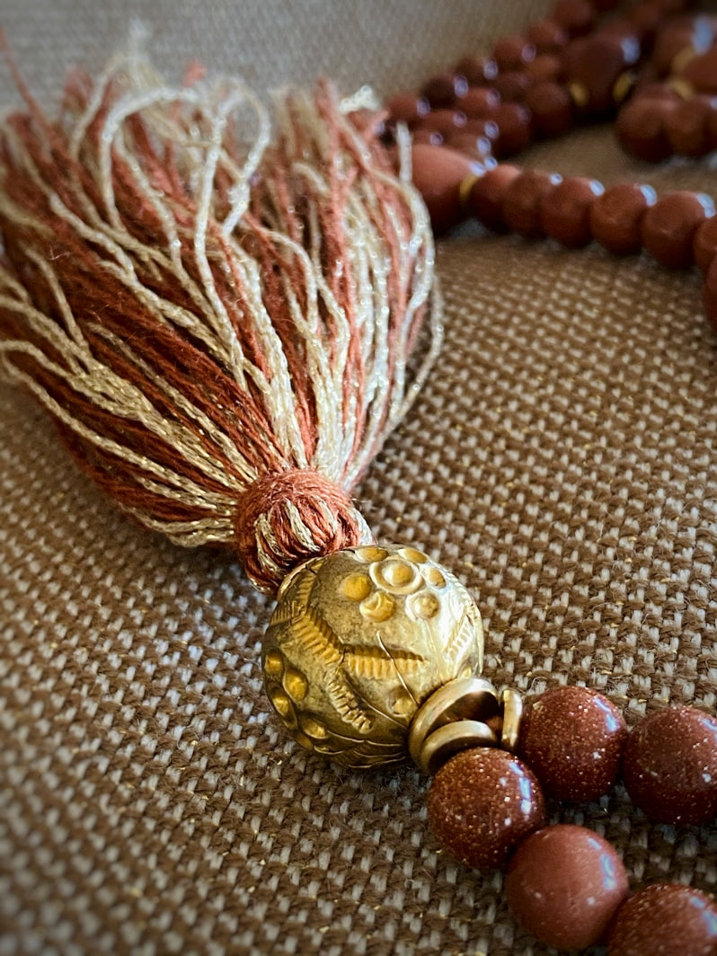 Abschluss: In Thailand handgearbeitete Ton-Kugel, mit Blattgold und Gravuren verziert und besondere handgearbeitete Quaste aus Seiden-Leinen-Garn und Gold-Lurex