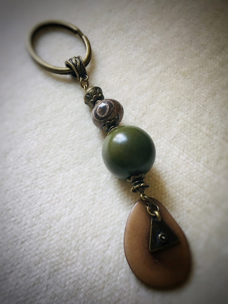 Ovaler Schlüsselring aus Messing mit Anhänger aus Achat, Tagua-Nuss und Magischem Dreieck