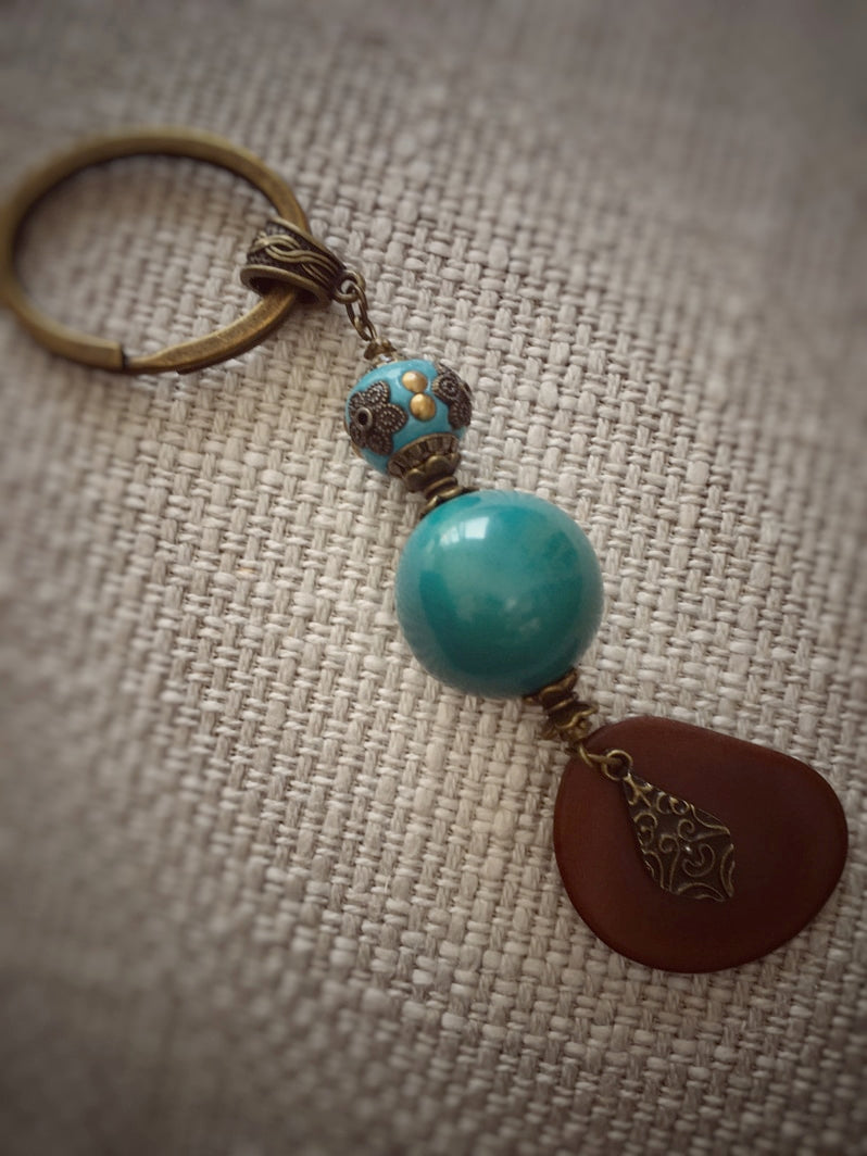 Ovaler Schlüsselring aus Messing mit türkisfarbenem Anhänger aus Tagua-Nuss und Kashmiri-Perle