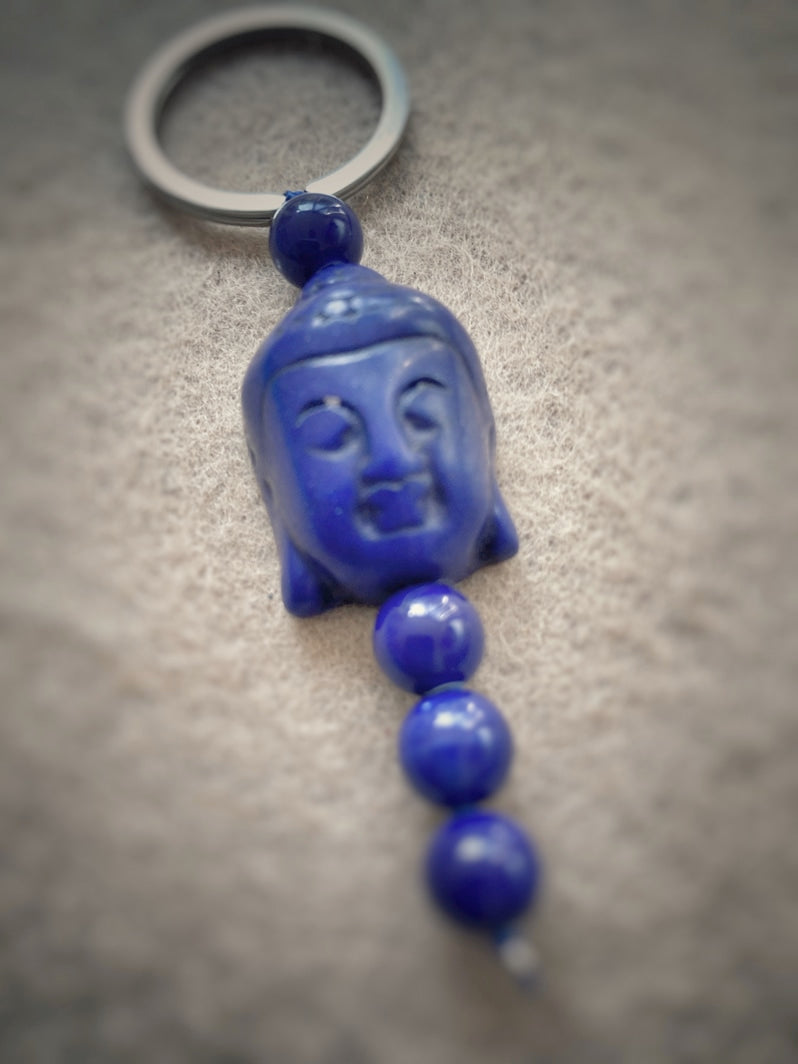 Schlüsselanhänger - Silberfarbener Metallring mit blauem Buddha mit italienischen Keramikperlen