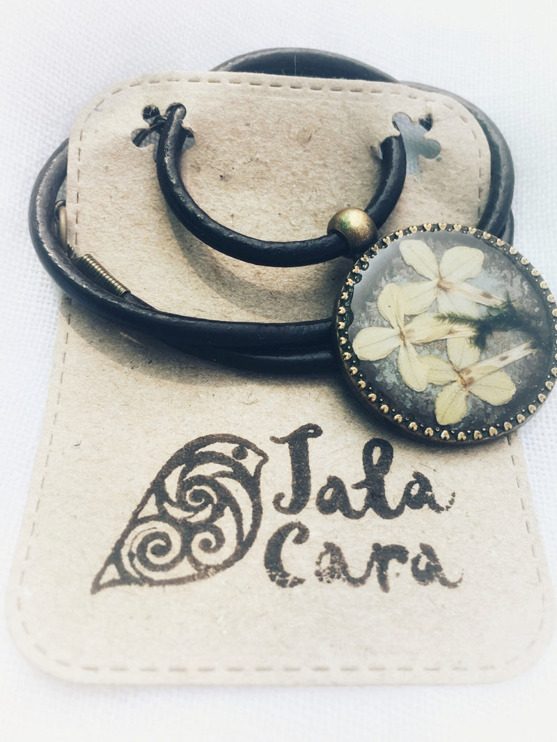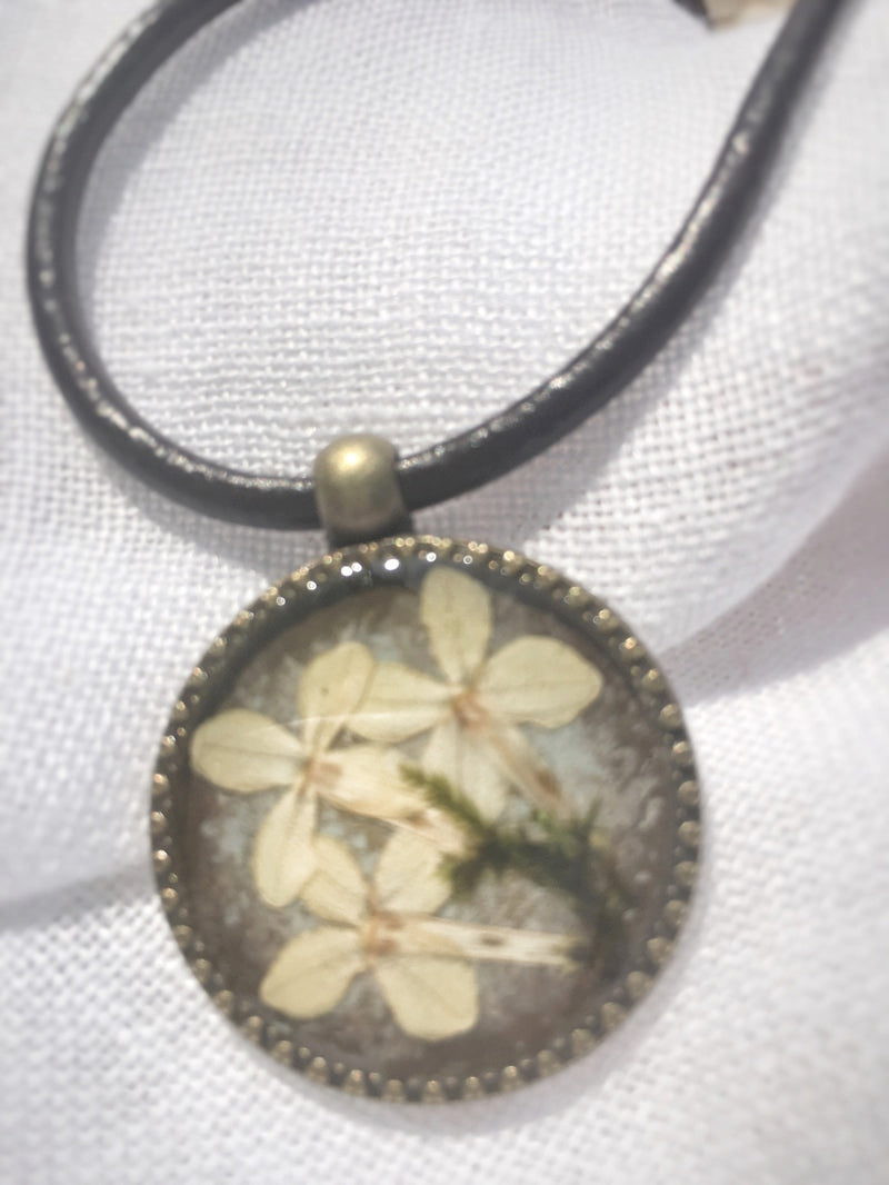 Sehr schönes Amulett mit Blüten in Harz gegossen an einem Lederband