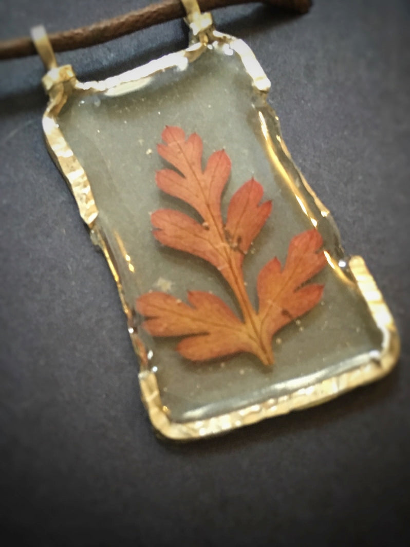 Schönes rotes Blatt in rechteckigem Anhänger. Selbst gesammelt, getrocknet, liebevoll in Harz gegossen und mit Wirework umwickelt von Patrik aus Prag.