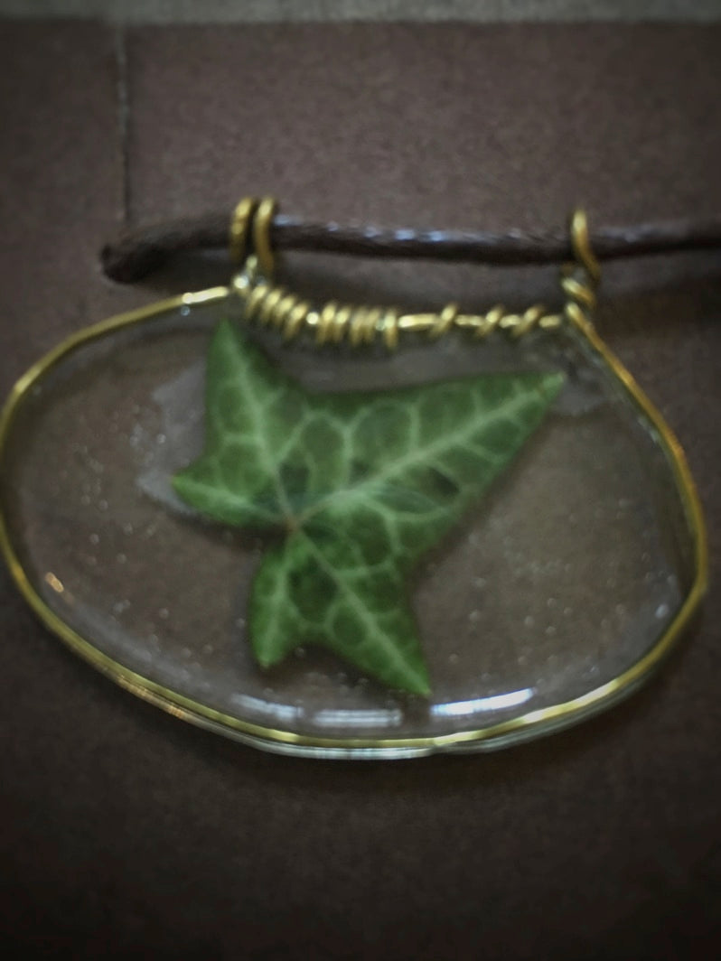 Kleines feines Efeublatt in ovalem Anhänger. Selbst gesammelt, getrocknet, liebevoll in Harz gegossen und mit Wirework umwickelt von Patrik aus Prag.