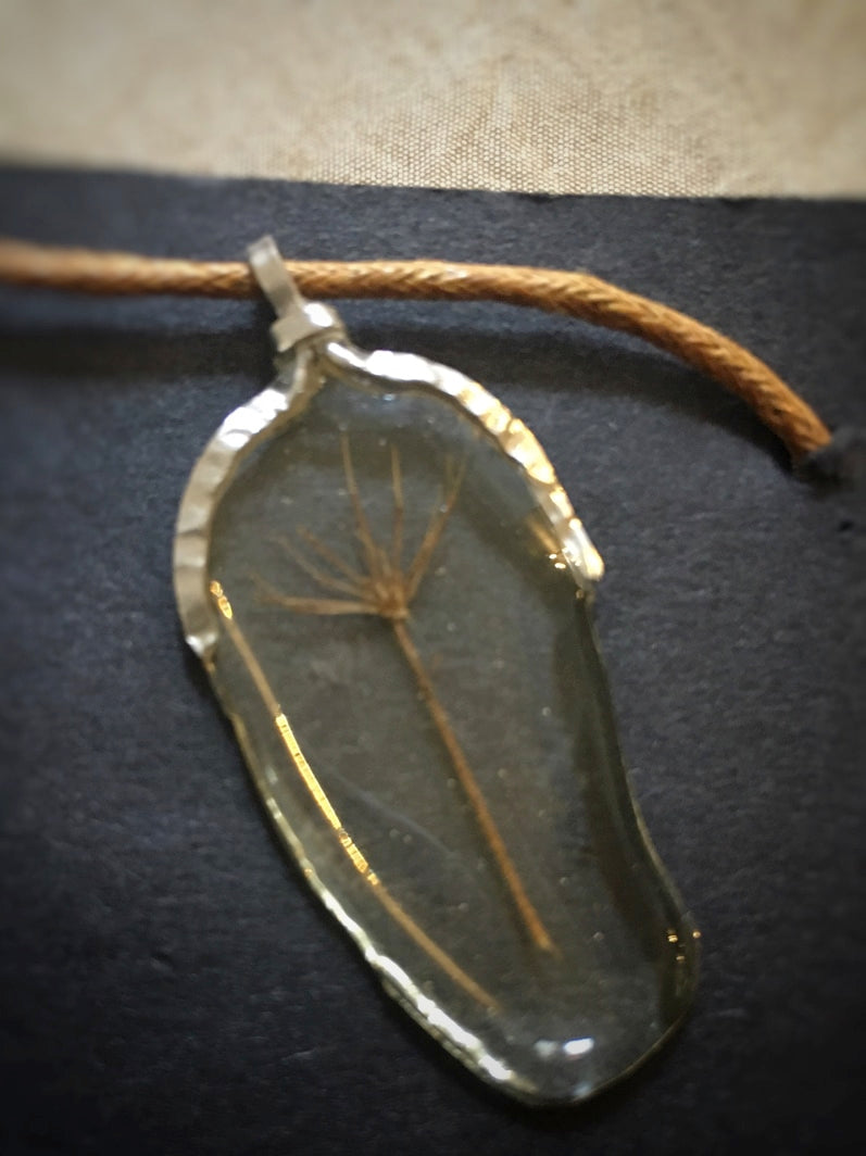 Zierliches Pusteblümchen in ovalem Anhänger. Selbst gesammelt, getrocknet, liebevoll in Harz gegossen und mit Wirework umwickelt von Patrik aus Prag.