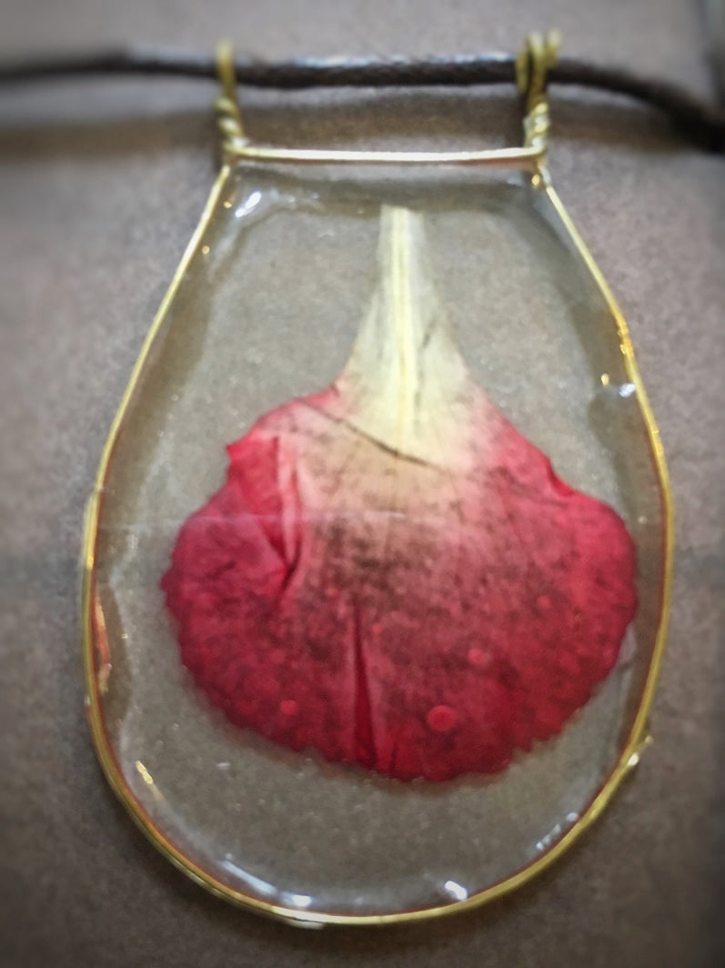 Rotes Blütenblatt einer Hortensie in ovalem Anhänger. Selbst gesammelt, getrocknet, liebevoll in Harz gegossen und mit Wirework umwickelt von Patrik aus Prag.