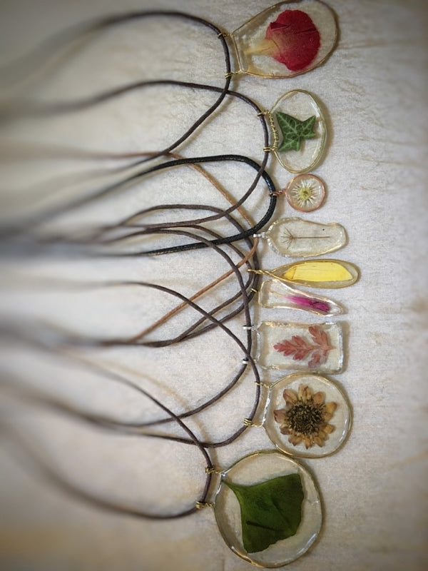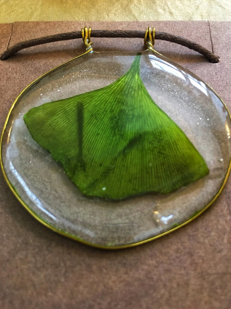 Gingko in rundem Anhänger. Selbst gesammelt, getrocknet, liebevoll in Harz gegossen und mit Wirework umwickelt von Patrik aus Prag.