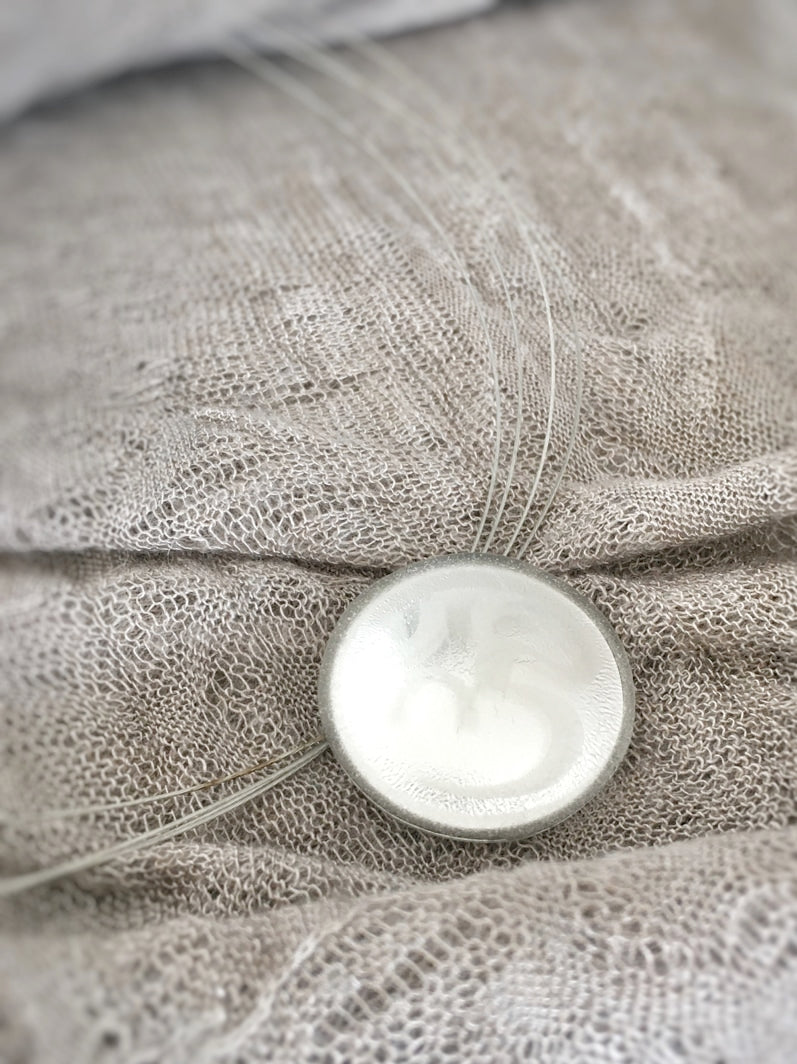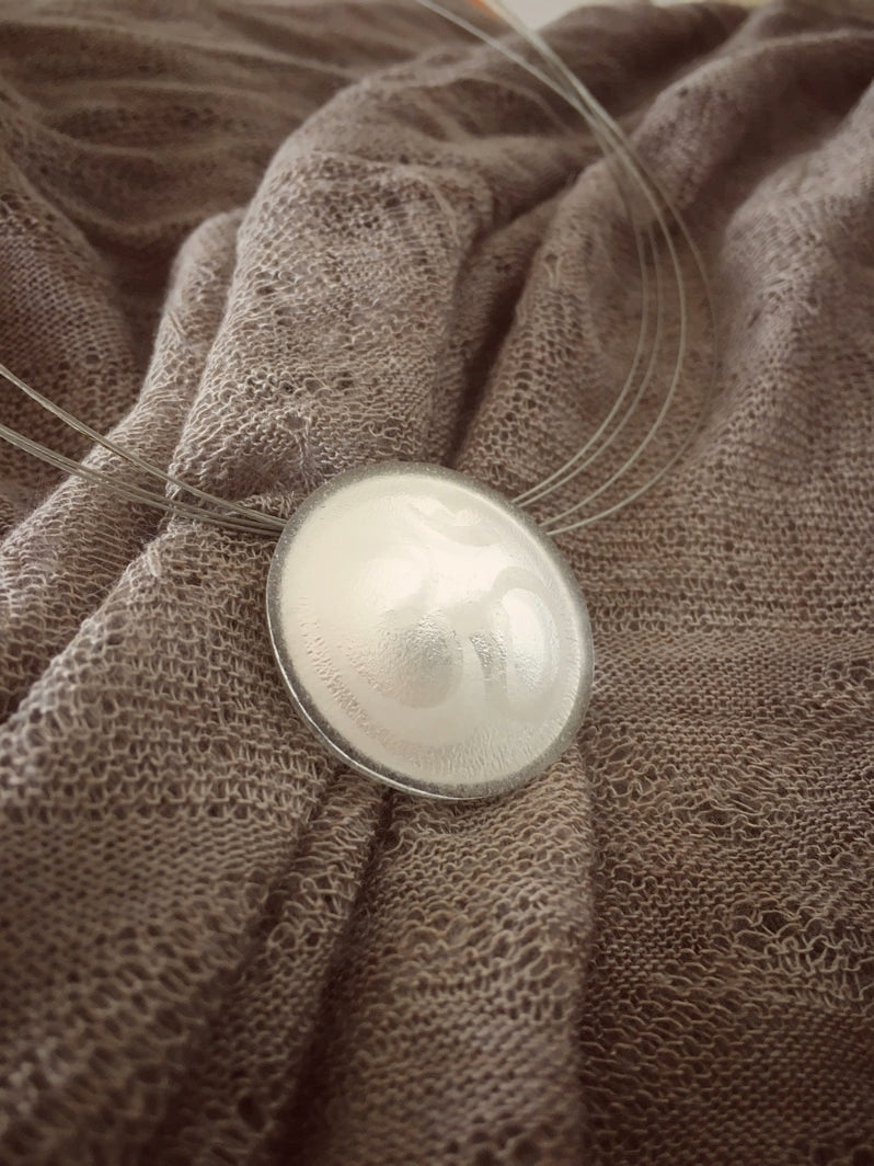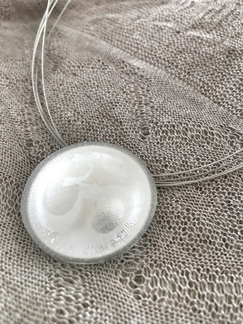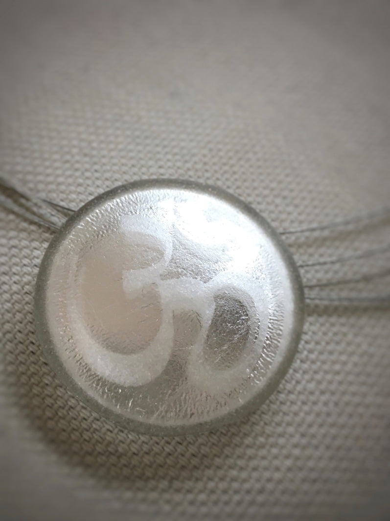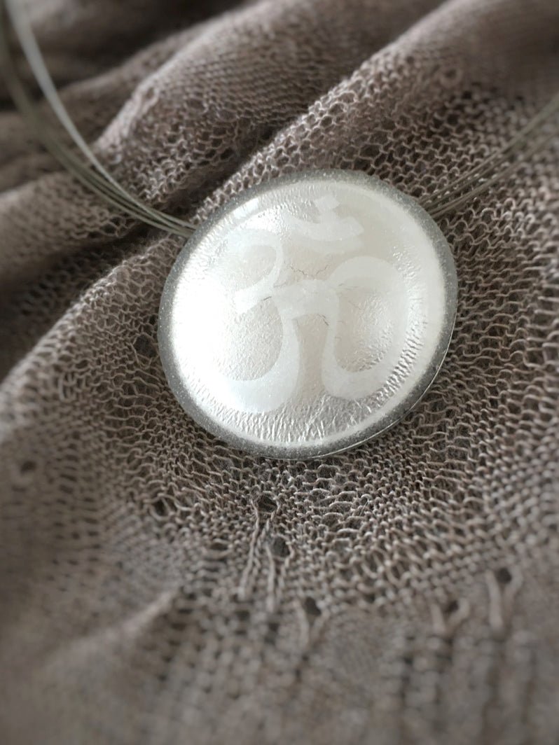 Einzigartige Glaskunst an einem mehrteiligen Halsreif - Silberfolie hinter Glas mit eingelegtem OM von einer Künstlerin aus Auroville in Indien