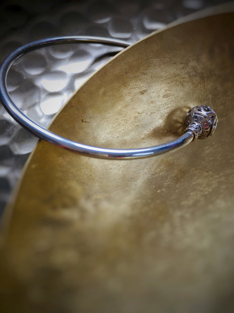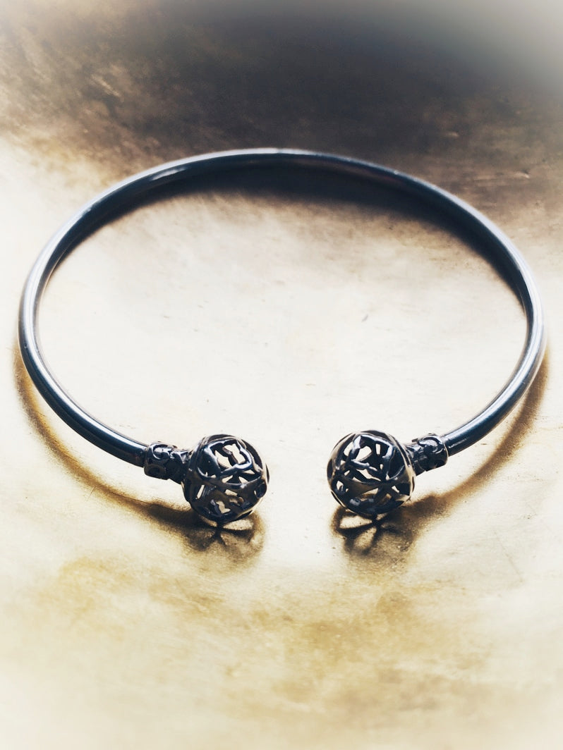 Feiner Armreif mit kunstvoll verzierten hohlen Kugel-Abschlüssen