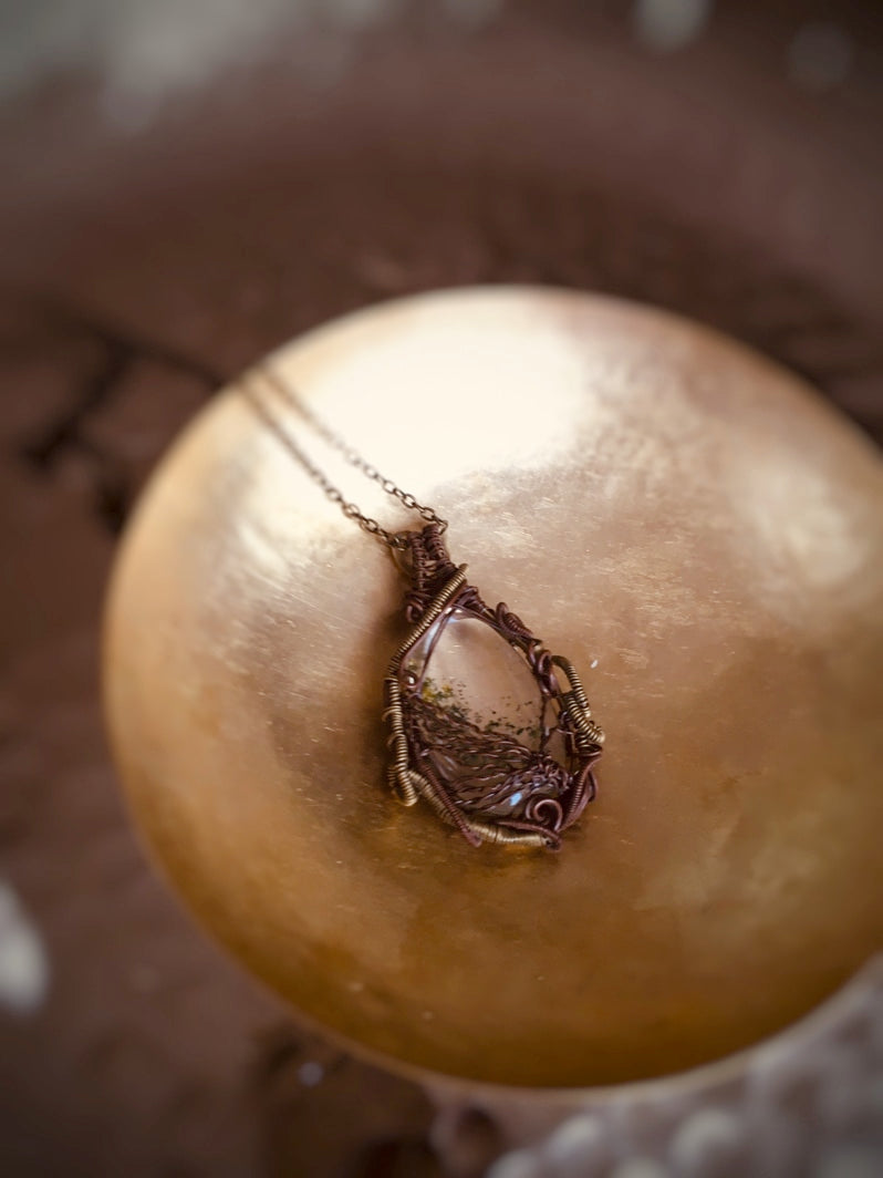 Edel in Wirework verpackt ist dieser kristallklare Moosachat, mit passender bronzefarbener Gliederkette - Handarbeit von Sehera aus der Türkei